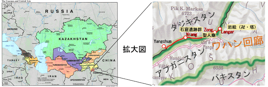 昨年のタジキスタン調査時に、三好臨時大使から「イシュカシムに洞窟寺院がある」との情報を入手していた。さらに、学術財団の科学研究費助成金獲得という幸運も重なって、2005年8月1日から8月6日までの日程でパミール調査を実施することができた。私はそれまで、この調査をイシュカシム仏教遺跡調査と位置付けていたが、実際はイシュカシム地域の遺跡群と言うべきことがわかった。今になって振り返れば、それはドシャンベの研究者、とりわけてボヴノヴァ博士からの情報に基づいていたと考えられる。私たちは、幸いにも出発前にボブノヴァ博士から具体的な遺跡の状況について情報を得ることができた。博士によると、Vrang(ヴラング)石窟寺院遺跡(僧院址と推定)とLangar(ランガール)岩絵(ペトログリフ)−上地図参照−が仏教関連の遺跡だということであった。博士自身、アフガン戦争以前にこれらの遺跡を調査し、論文を発表したとのことである。