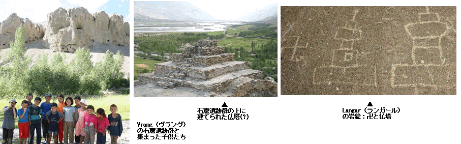 Vrangの石窟群は約50ほどの石窟がパンジ川に面して南側に向かって掘られている。西側と東側の岩場に分かれており、東側の岩場の上には石積みの仏塔らしい建造物があった。上図では南側にパンジ川がながれているのがわかる。この川の両側に東西を結ぶ街道が続いている。Handud(アフガニスタン)の対岸にあたるYangchu城址は街道監視が目的であったと考えられ、統治国家(『大唐西域記』所説の達摩悉鉄帝国?)の権威を示すものである。LangarはVrangから東へ25Kmほど入った場所にある。小高い丘の上(といっても全体的に標高が高いので3500mほどの高さ)の大きな岩の上に卍と仏塔の絵が描かれている。ボヴノヴァ博士の説では、Vrang石窟遺跡群とほぼ同じ、7世紀から9世紀のものということである。仏塔の形はインドのストゥーパよりも中国の「塔」に近いようにも思われる。東西交易の中で東方文化がもたらされた例とも言えようか。