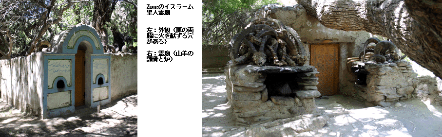 パミールでは仏教以外の宗教、とりわけゾロアスター教の痕跡を随所で見ることができた。VrangとLangarの中間にあるZongの村でイスラーム聖人の霊廟を見学したが、それはゾロアスター教の影響を強く留めていた。霊廟の入り口には火を献ずる施設が設けられている。廟内部にも、入り口の両側に火を献ずる炉が見られた。また、その炉の上には山羊の頭骨・角がうずたかく供えられている。この地域では、山羊は太陽神ミフルと関係が深いものとして尊崇されてきた。また、霊廟床面には太陽をモチーフとした模様が描かれている。その模様はパミールの民家でもよく見ることができるものである。