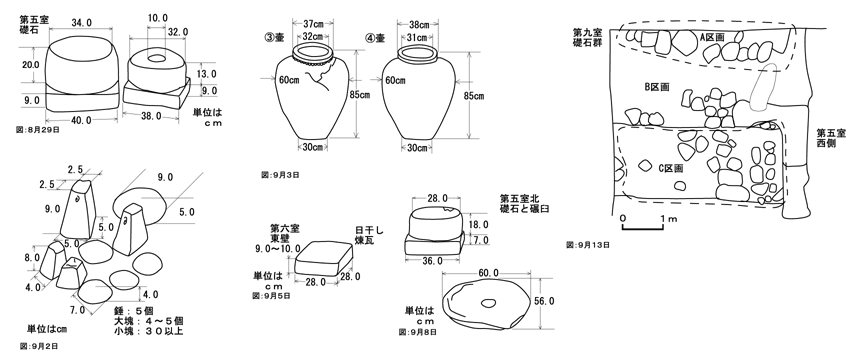 9月6日、KKF-XI第二室の石組みの図化をおこなう。スタッフ5mを全て伸ばしてやっと測定できるほどの深さである。石組周辺からの遺物は出土していない。人為的遺構でない可能性もあるだろう。KKF-XIの発掘はここまでで、しばらく中断することになる。KKF-X第五室では床面検出作業が難航している。複数世代にわたって使用されたため、床面も数層になっているようである。第五室東側、第六室付近で容器蓋が出土する。