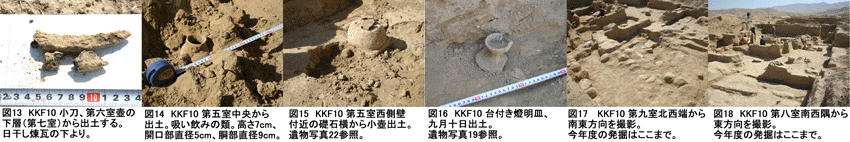 9月10日、KKF-XIでは中断していた作業を再開する。発掘範囲を北側に3m拡張する。第一測点からの作図は無理となったため、北側に測点を移動する。KKF-X第五室の北側の発掘作業が進む。第五室西側壁付近の礎石横から小壺(KKF-X発掘:図15、遺物:図22)、さらに台付き燈明皿(KKF-X発掘:図16、遺物:19)が出土する。第八室では小石を敷き詰めた一画があり水はけを考慮した構造のようである。その周囲には日干し煉瓦が敷き詰められた場所もあり、浴室あるいは水浴場の可能性もあるとのことである。