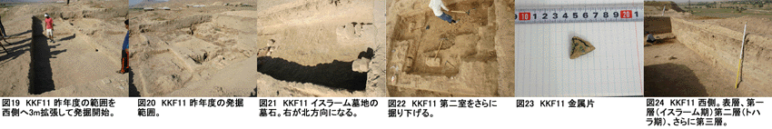 8月23日、KKF-XIでは北側に石組みが検出されている。イスラーム期の墓石である。写真撮影(KKF-XI発掘:図21)。南側では南東隅から北へ1.25m、西へ0.4mから甕(高さ55cm、甕の口の外径34cm、内径29cm)が出土し、取り上げる。移送中に崩壊し、口の部分を含めた上部三分の一が残った状態となる。後に、接着剤で復元される。