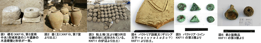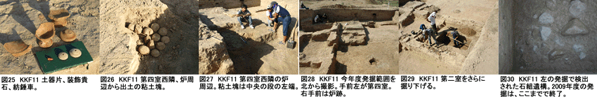 KKF-XIでは西側3m拡張部分にあった石組みの墓石を取り上げ、さらに深く掘る。中央部分でも掘り下げ作業を行っている。KKF-Xでは第六室、北東部分の壁の下からソファー状段とみられる日干し煉瓦が出土する。また同所から羊骨の玩具14個(遺物:図6)が出土する。煉瓦と壁の間から水差しの頭部破片(遺物:図4)が出土、周囲の煉瓦上面から10cm下にあたる。第六室中央から炭化した柱片(遺物:図5)が出土する。