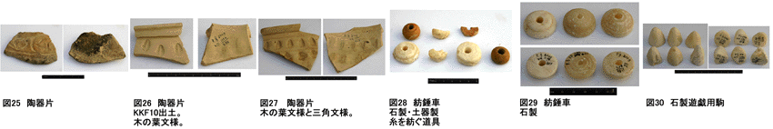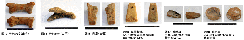 昨年の発掘時にもほぼ同じ場所から焼成後の錘が数個出土していた。城塞内で多数の錘が作成されて、周辺地域の商取引に使用されたものと考えられる。焼成時の重さが基準の値になるようにするためには、一定の技術が必要であったと考えられる。KKF-XIでは第五室西側でメノウのネックレス玉が出土する。長さ2cm、幅1cmで、縦に穴が開けられている。