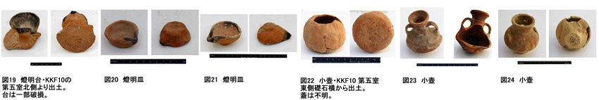 9月7日、KKF-X第六室の床面検出作業を続行する。遺物の取り上げはまだまだ問題が多く、作業員が無造作に取り上げて、後で研究員に手渡すことも多い。出土位置の確認が十分にできない状態である。第五室の中央から病人用とみられる吸い飲み(KKF-X発掘:図14)が出土する。高さ7cm、開口部直径5cm、胴部直径9cmの陶器である。